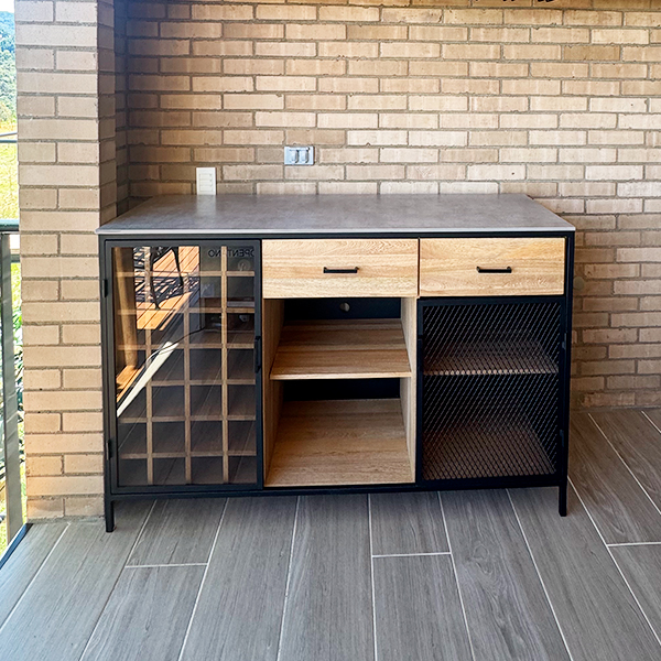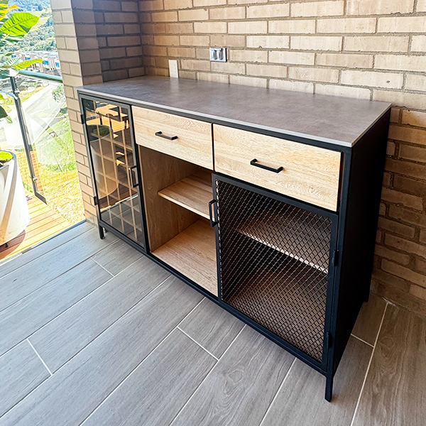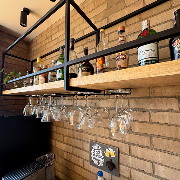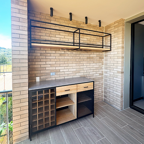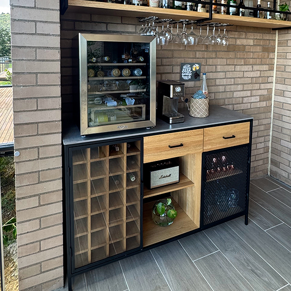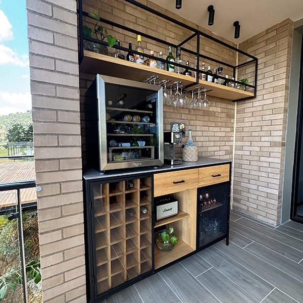 Mueble bar de piso fabricado con estructura de hierro en tuberia cuadrada de 3/4" color negro mate, el interior va fabricado con madera de roble natural, lleva 2 cajones de riel con tiradera, 2 espacios para botellas donde uno de estos lleva puerta de hierro con malla y una seccion para botellas de vino con puerta en Angulo de hierro con vidrio, la superficie superior del mueble lleva piedra sinterizada gris mate tipo concreto. Tiene una repisa bar anclada a muro fabricada en hierro y un tablón de roble natural, lleva por debajo herraje para colgar copas de cristal.