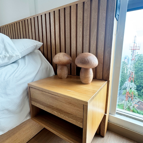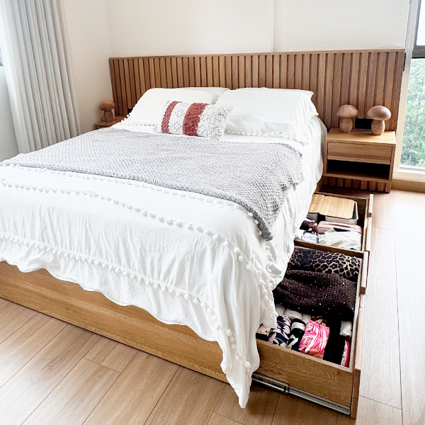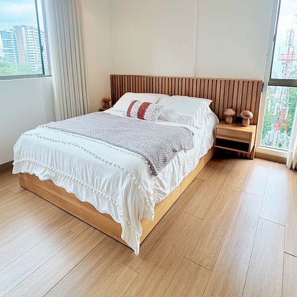 Cama para colchón de 140 x 190cm fabricada en madera de roble con espaldar de 280 x 110cm con listones de roble macizo y tomacorriente negro en cada lado, lleva 2 nocheros flotantes cada uno con nido abierto y cajón de riel, en la parte inferior incluye 4 cajones de riel amplios. *Incluye soporte en MDF para colchón.