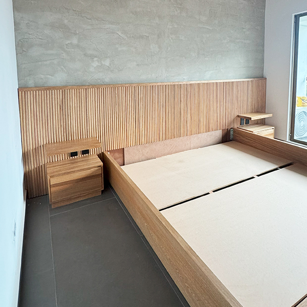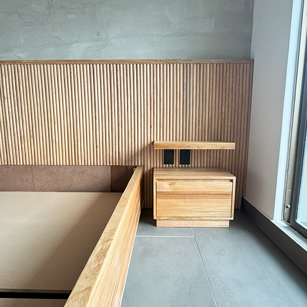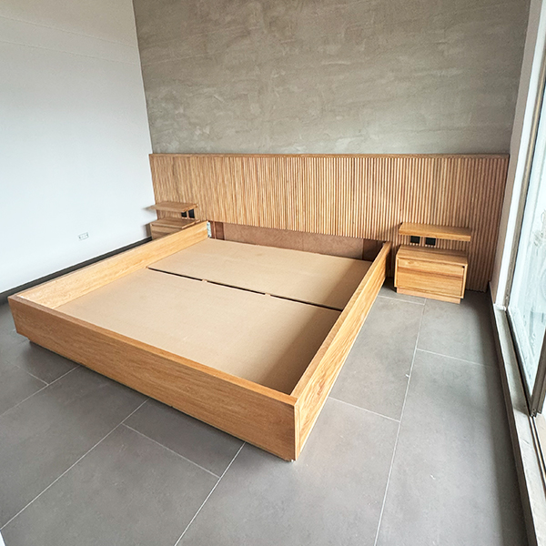 Cama para colchón de 2x2m fabricada en madera de roble con espaldar de 3,80 x 110cm con listones de roble redondeados macizos y tomacorriente negro en cada lado y suiche de encendido, lleva 2 nocheros de piso con 2 cajones de riel cada uno y un entrepaño flotante anclado al espaldar, en la parte inferior incluye 4 cajones de riel amplios. *Incluye soporte en MDF para colchón.