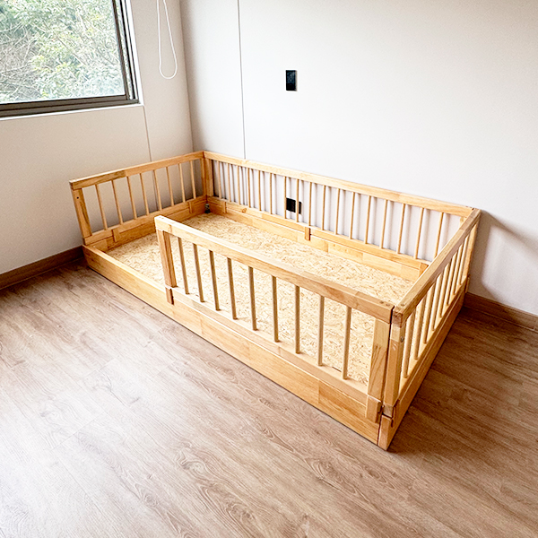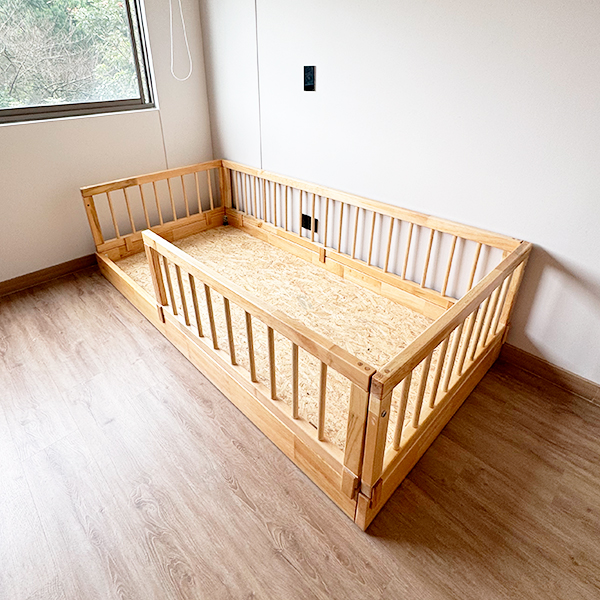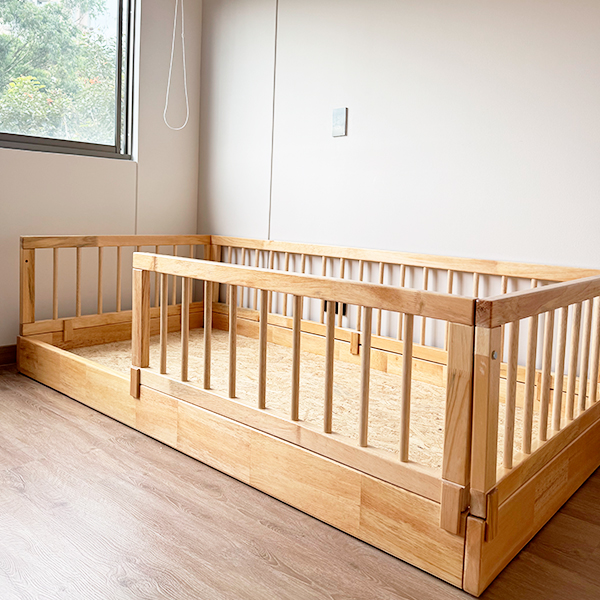 Cama Montessori bebé para colchón de 100 x 190cm fabricada en madera de pino con acabado mate, lleva soporte para colchón en tablero de madera prensada, liviana y fácil de armar.