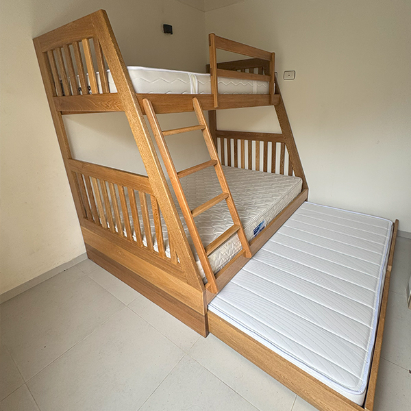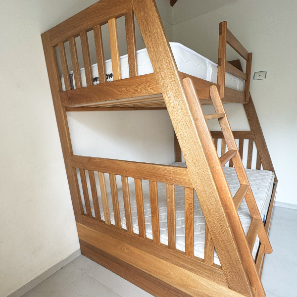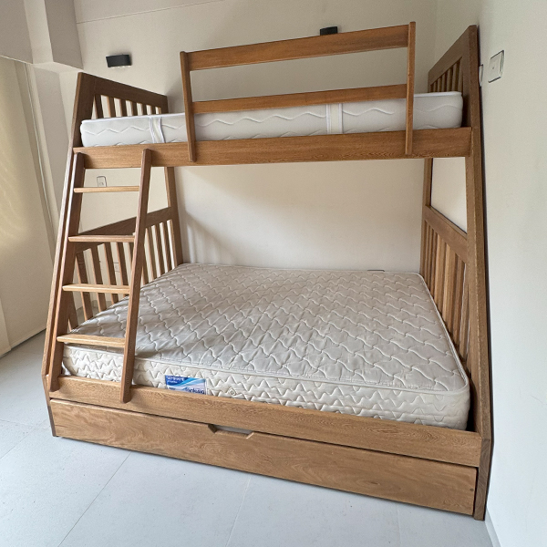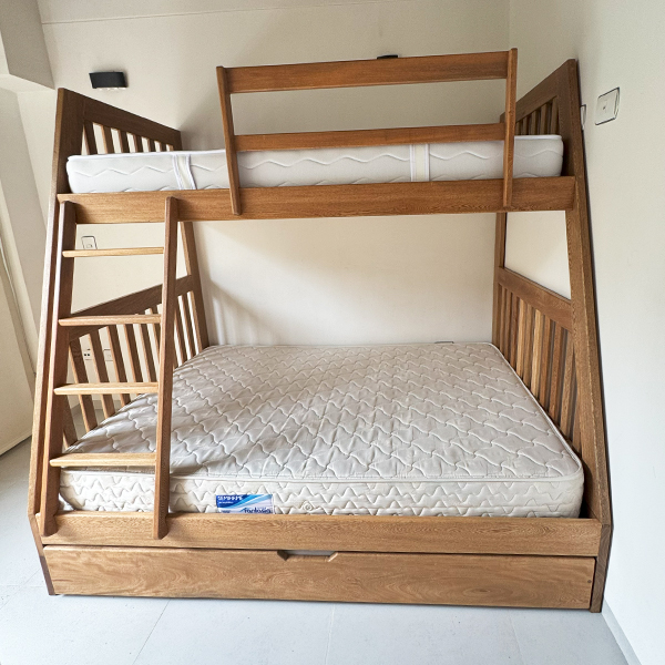 Camarote fabricado en madera de roble natural con acabado en laca mate, cama principal para colchón de 140cm, cama superior camarote y cama tarima inferior colchón de 100cm.