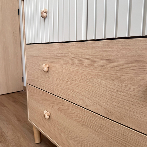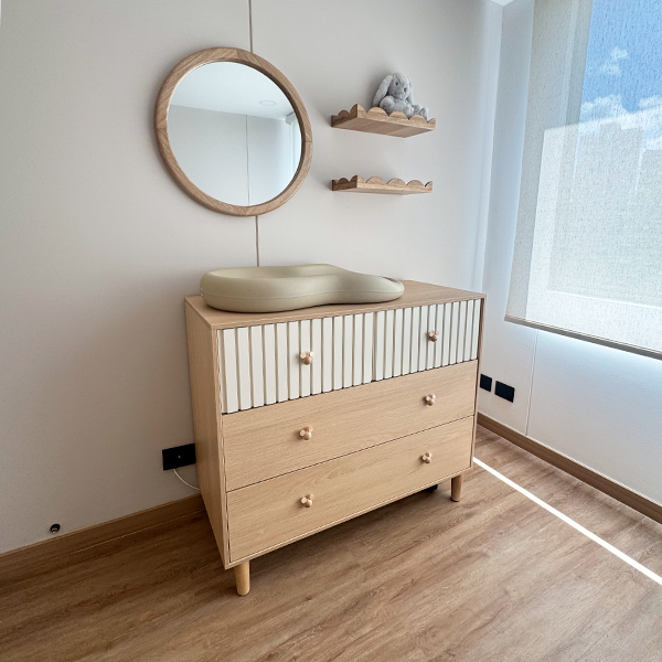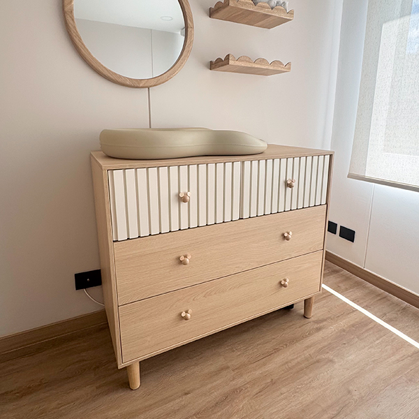 Cambiador de bebé fabricado en madecor RH color Carvalo con cajones superiores color blanco poliuretano con ranurado, pomos de cajón Mickey mouse en madera.