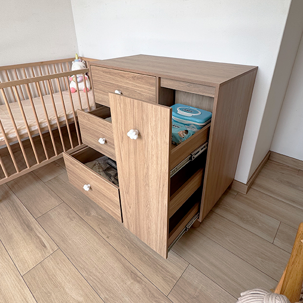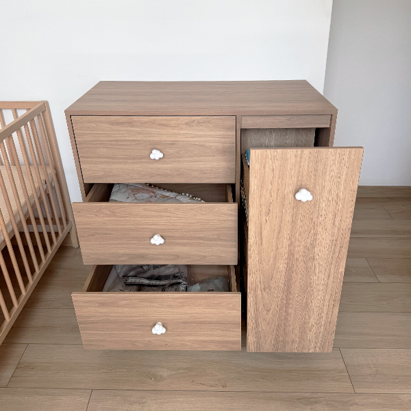 Cambiador fabricado en madecor RH con pomos de cajon de nube, lleva 3 cajones de riel y una puerta riel con 3 compartimientos internos.