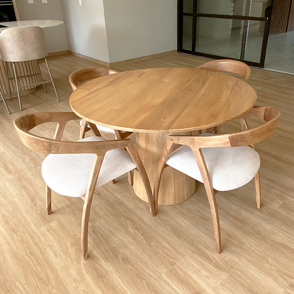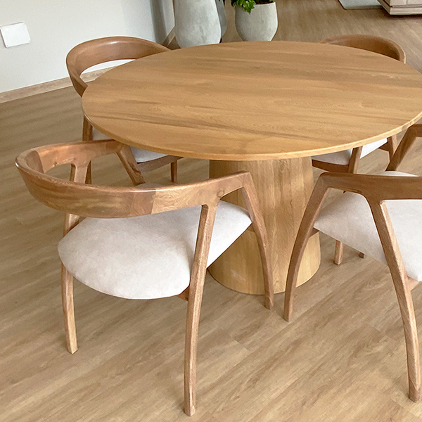 Mesa de comedor redonda de 140cm de diámetro, fabricada en chapilla de roble, va a acompañada de 4 sillas de madera de roble maciza con cojín en asiento tapizado en tela anti fuido.