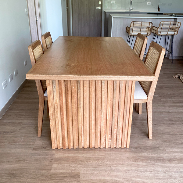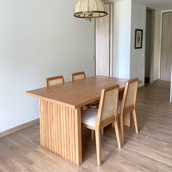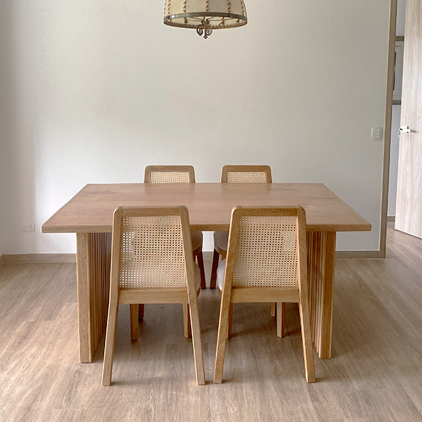 Mesa de comedor de 4 puestos fabricada en madera de roble natural macizo con laca mate, lleva tableros a piso con textura de listones, este juego trae 4 sillas de madera con cojín y espaldar con tejido de esterilla sintética..
