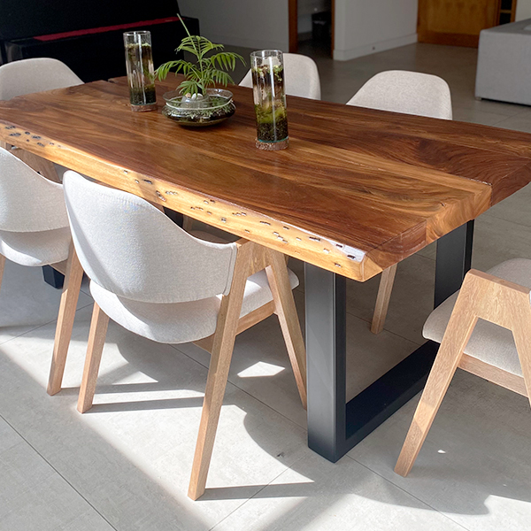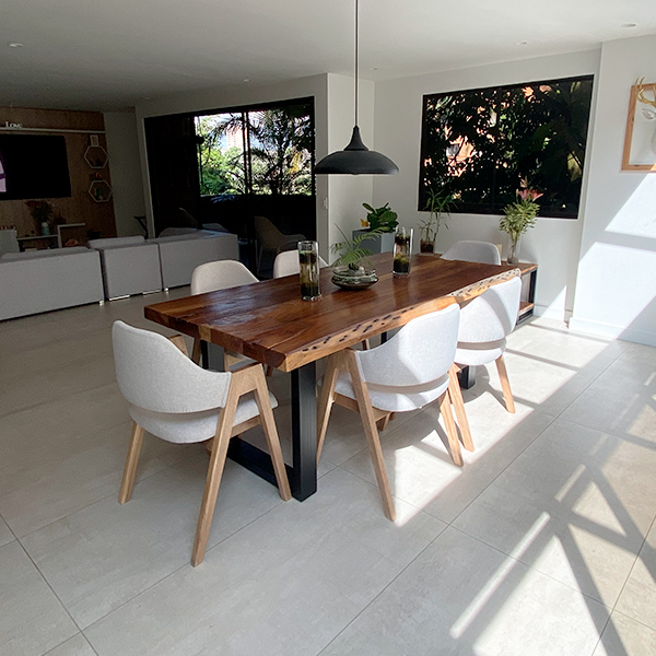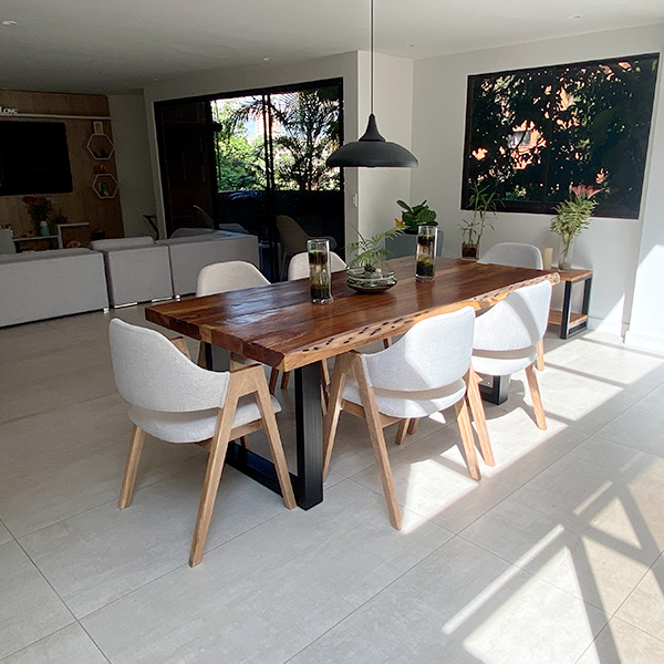 Mesa de comedor con base de hierro con perfil rectangular y tablón macizo grueso en madera de piñón de oreja con laca mate, lleva 6 sillas de roble natural con asiento y espaldar tapizados en tela anti fluido premium