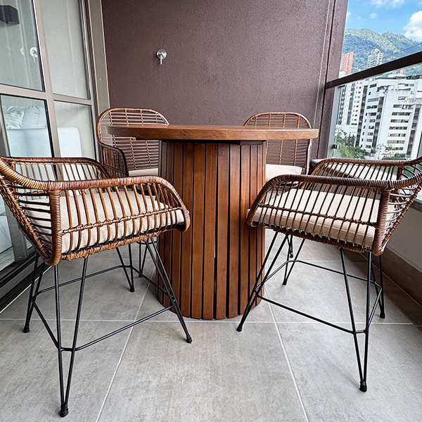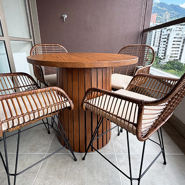 Mesa de comedor redonda fabricada en madera de teca con acabado oscurecido, lleva 4 sillas de hierro con tejido de mimbre y cojín para exterior.