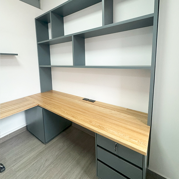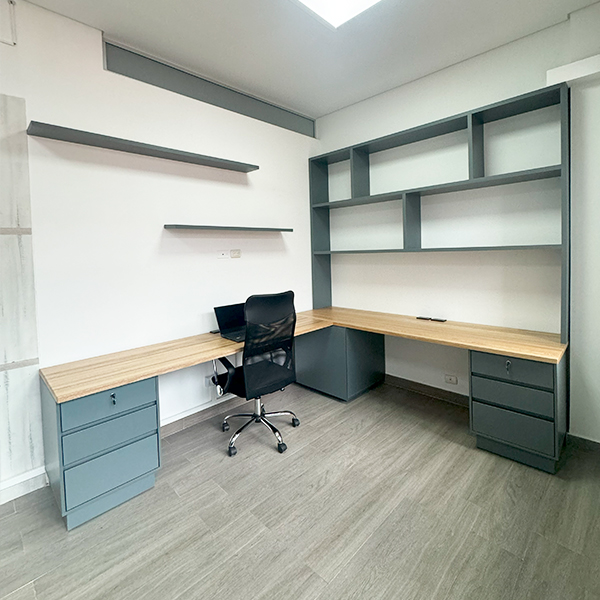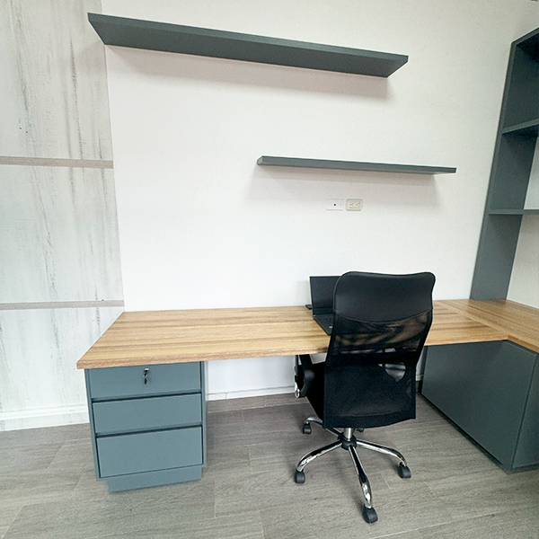 Escritorio de gerencia fabricado en madecor RH color azul pacífico con tablón en madera de roble natural, lleva tomacorrientes para conectar dispositivos, y 2 archivadores con 3 cajones cada uno, en una sección lleva repisas flotantes y en otra lleva biblioteca.