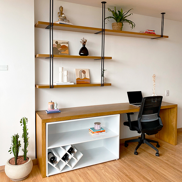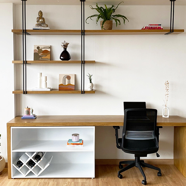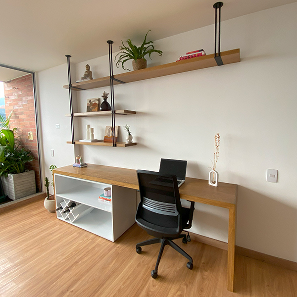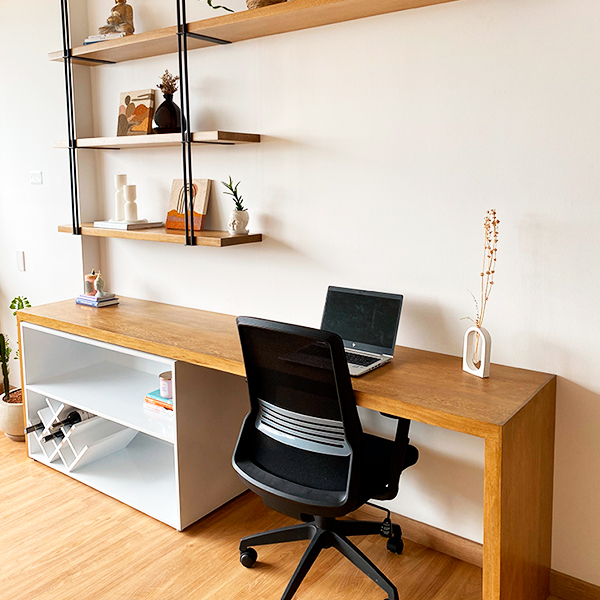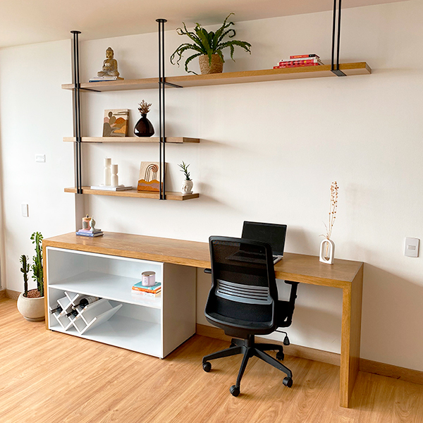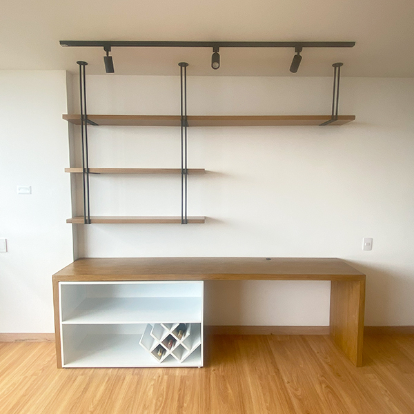 Escritorio de roble natural con mueble bar en pintura blanca de poliuretano brillante, lleva repisa descolgada de techo con soportes de hierro negro mate y tablones macizos de roble.