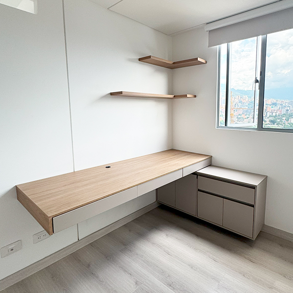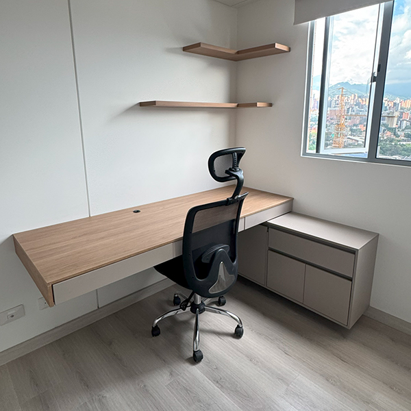 Escritorio fabricado en madecor RH color Sagano y Taupé, lleva archivador lateral anclado a muro con 2 puertas y 2 cajones de riel en color Taupé, además lleva 2 repisas flotantes, ideal para espacios en esquinas para modular en L.
