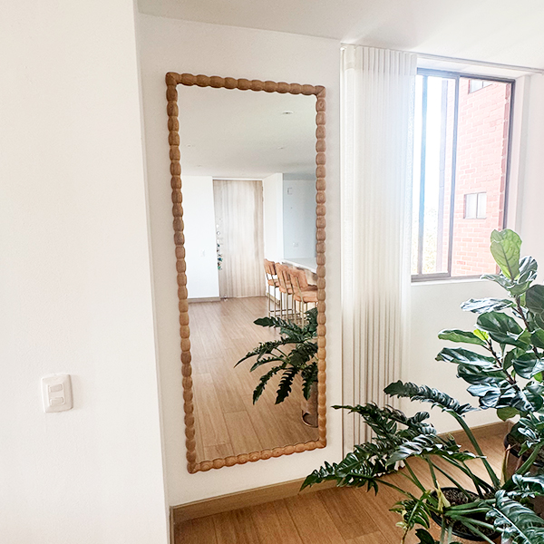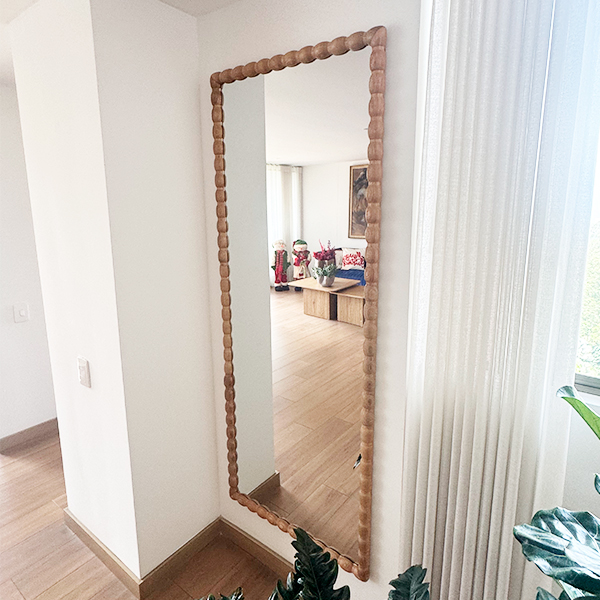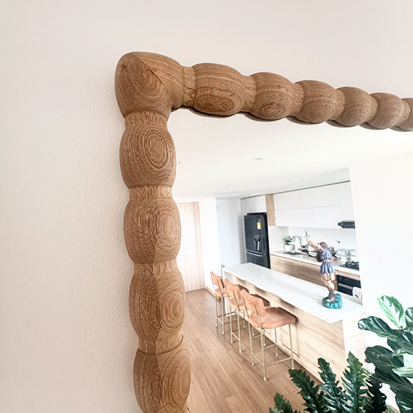 Espejo con marco fabricado en madera de roble natural con proceso manual de torno, lleva acabado en laca mate, vidrio pulido y brillado color natural.