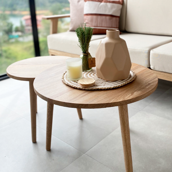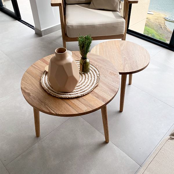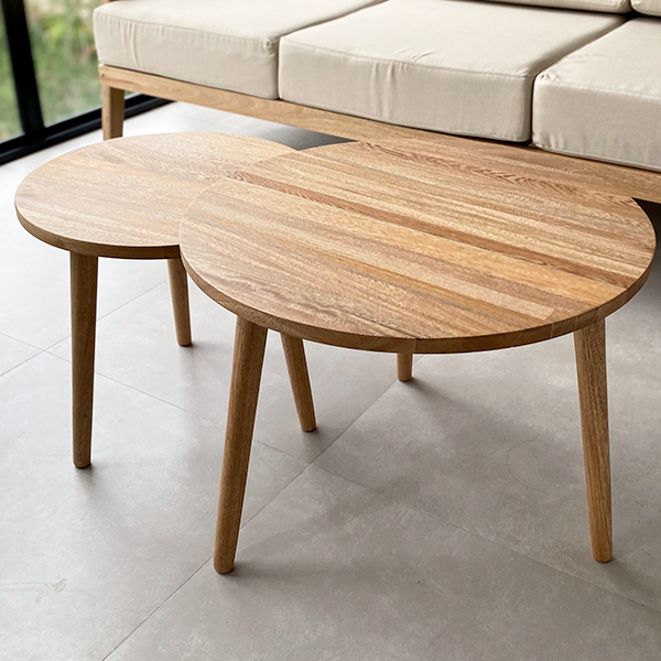 Juego de dos mesas de centro redondas fabricadas en madera de roble natural con laca mate