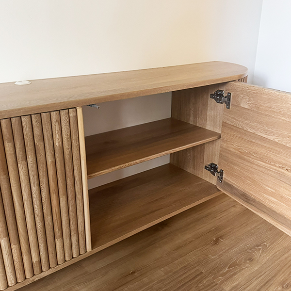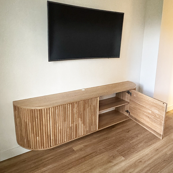 mueble flotante anclado a muro fabricado en madera de roble con frente curvo en textura de listones redondos torneados, lleva 2 puertas de bisagra y entrepaño centrado interno.