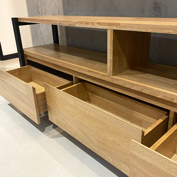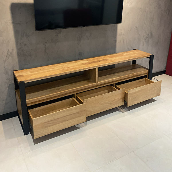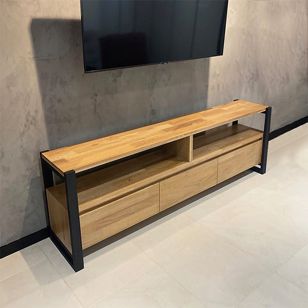 Mueble de piso fabricado en madera de roble natural montado sobre perfiles de hierro rectangulares en tubería de 2x1" con acabado en pintura electrostática negro mate, lleva 3 cajones de riel y 2 espacios para dispositivos.