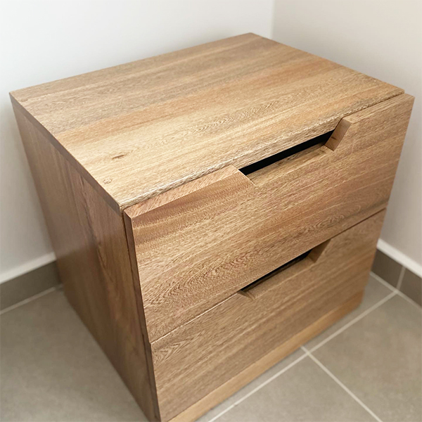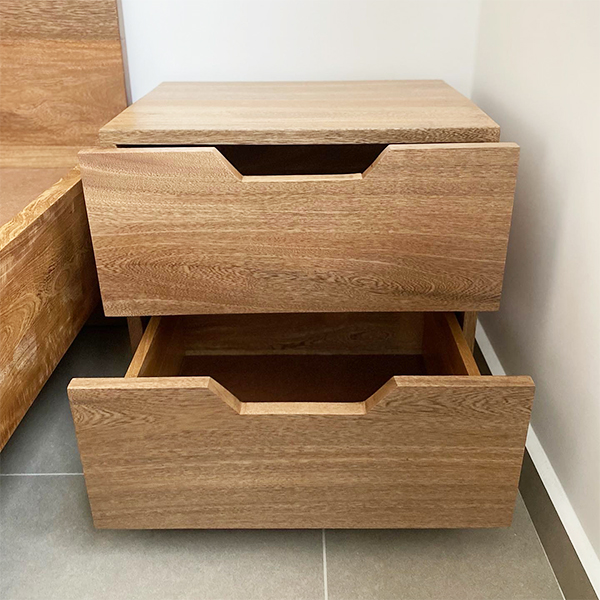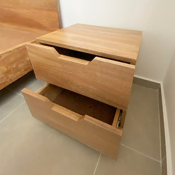 Nochero fabricado en madera de roble natural con acabado en laca mate, lleva dos cajones de riel.