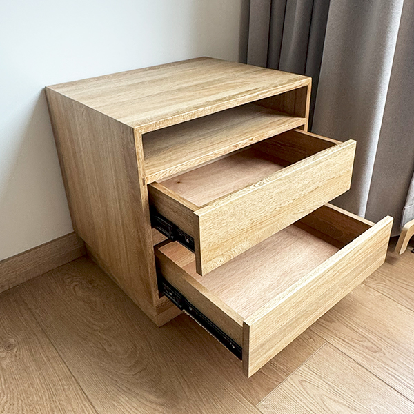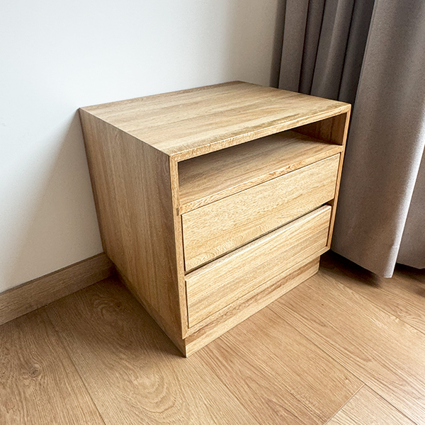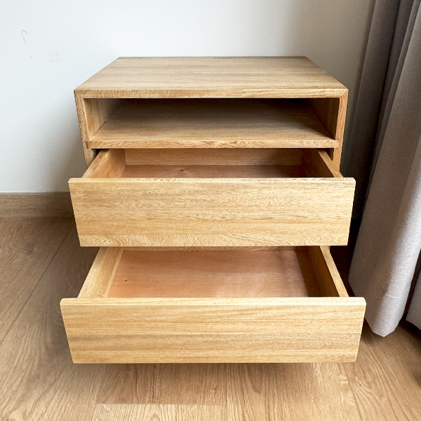 Nochero fabricado en madera de roble natural con laca mate, lleva un nido abierto y 2 cajones de riel.