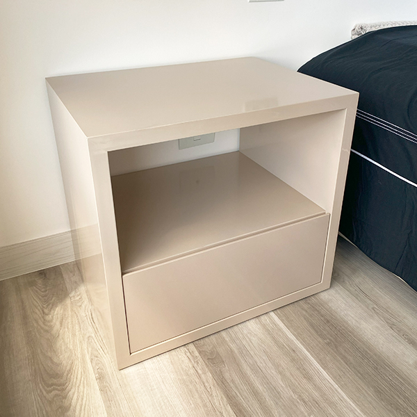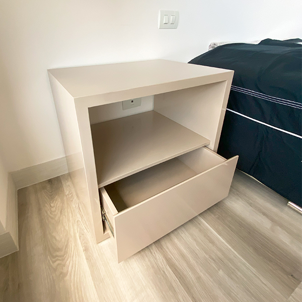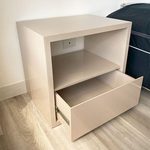 Nochero fabricado en MDF RH con acabado en pintura de poliuretano color taupé, lleva un nido abrieto para libros y un cajon de riel con cierre lento.