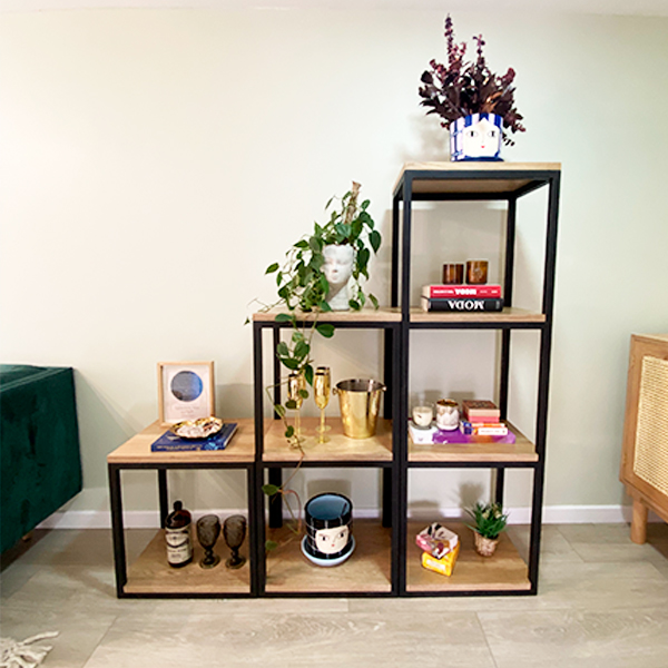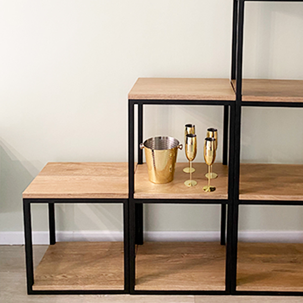 Repisa de piso fabricada en hierro de 1" perfil cuadrado con acabado negro mate, son 3 torres independientes modulables, lleva tablones en madera de roble o madecor RH.