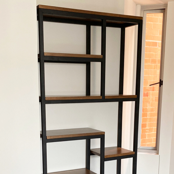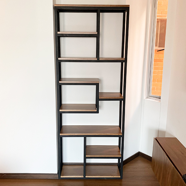 Repisa de piso fabricada en tuberia de hierro de 1" perfil cuadrado en acabado negro mate con pintura electrostática, lleva entrepaños en madera de roble natural con laca mate