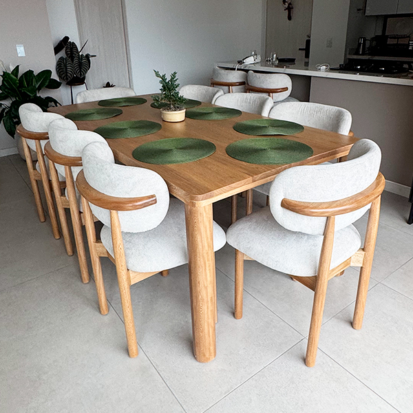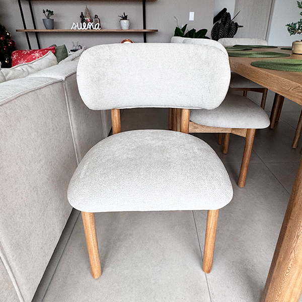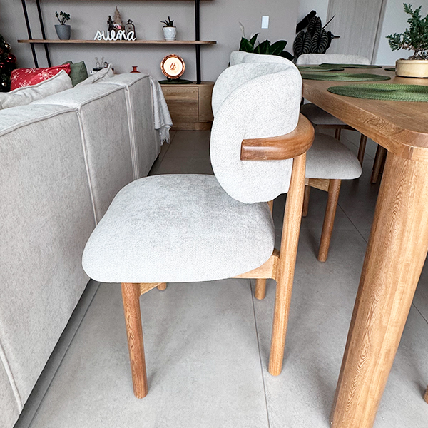 Silla fabricada en madera de roble natural con laca mate, lleva asiento y espaldar tapizado en tela premium antifluido.