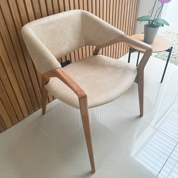 Silla para comedor fabricada en madera de roble natural, lleva tapizado en tela tipo prana, puedes elegir entre diferentes colores y tipos de tela para personalizarla. Diseño exclusivo de Armadillo mobiliario.