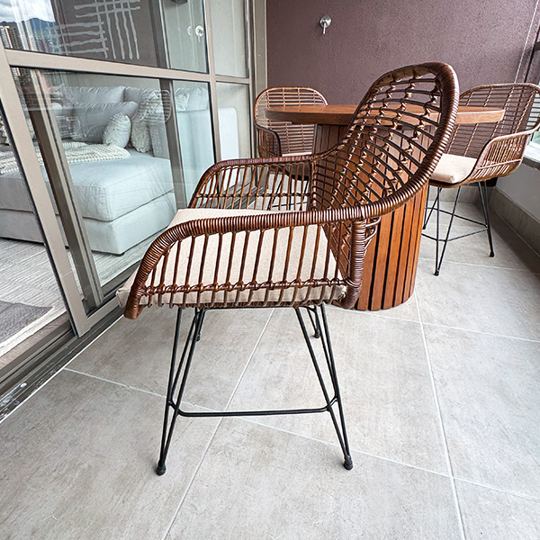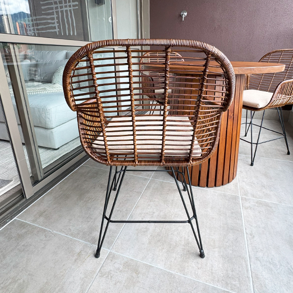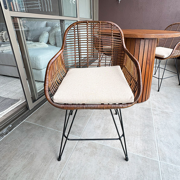 Silla fabricada en varilla de hierro con acabado en pintura negra, lleva tejido de mimbre natural con entintado café oscuro y cojín para asiento en tela anti fluido de fácil limpieza, esta silla es ideal para exteriores, balcones y terrazas.
